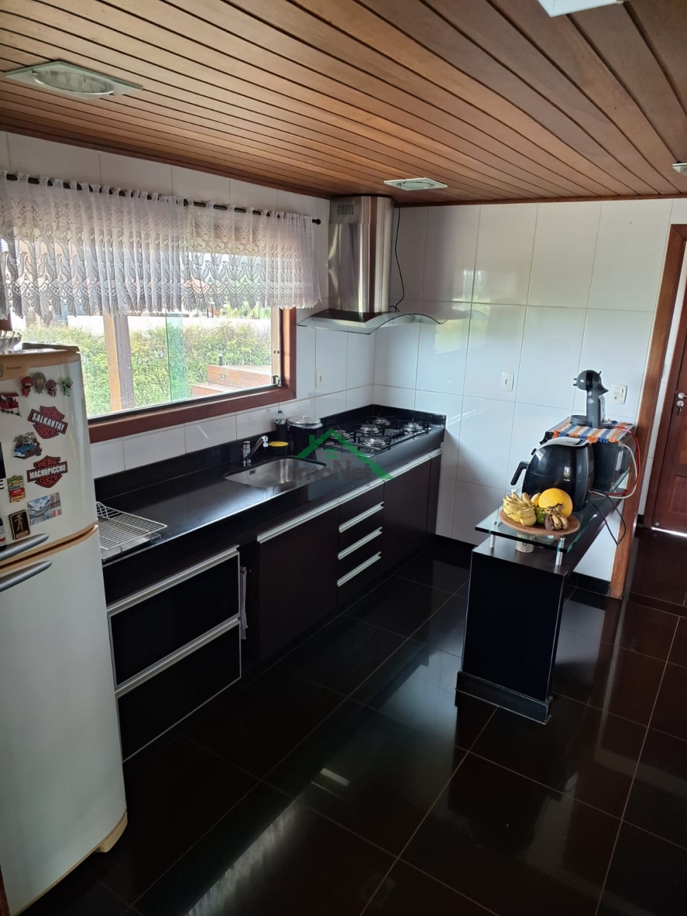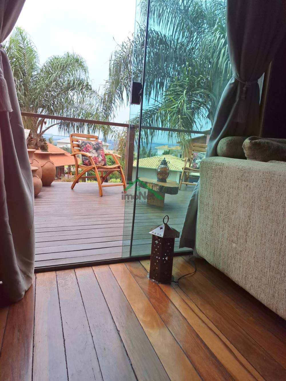 A casa possui 3 quartos (sendo 1 suíte), sala ampla para dois ambientes com pé-direito alto e lareira a gás e a lenha, cozinha moderna com armários e bancada em granito, área de serviço e sala de TV climatizada. Conta ainda com varanda com deck e linda vista para o Morro Três Irmãos.